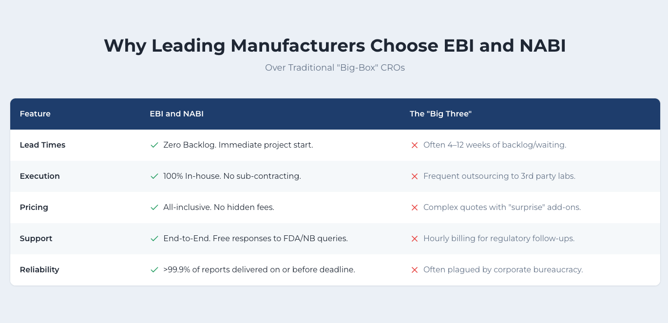 In an industry where delays cost lives and millions in revenue, EBI and NABI provide a seamless, transparent alternative to traditional "big-box" CROs. We don't just deliver data — we deliver your market authorization.